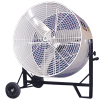 A powerful 60-inch belt-drive drum fan delivering high-volume airflow for large industrial and construction spaces.